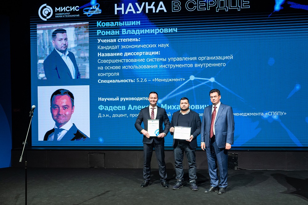 Также ректор наградила победителя конкурса «Аспирант года» Артёма Короля и его научного руководителя — д.т.н., профессора кафедры физического материаловедения НИТУ МИСИС Владислава Задорожного. Победитель получил единовременную стипендию в размере 100 000 рублей от Эндаумент-фонда НИТУ МИСИС.